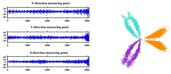 Figure 7a depicts the raw vibration signals of the three channels of the multi-channel sensor, and the conversion of the SDP technology can make the raw vibration time domain signals into the SDP images, as shown in Figure 7b, which can then visualize the health status of the detected object.