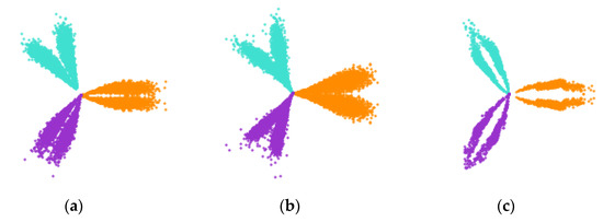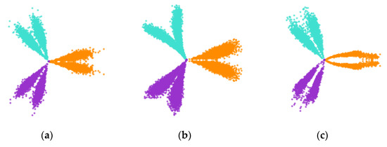 According to Figure 16, Figure 17 and Figure 18, most of the image features are different for each sensor dataset, mainly in arm thickness, concentration, and curvature, and from these feature indicators, the differences of the SDP image arms in the different states can be found. Figure 16, Figure 17 and Figure 18c show the degree of pitting of the SDP image from the normal state to the double pitting state. In Figure 18b the image arm was thicker when single pitting was present. Based on these discrepancies, it was possible to analyze the differences in the gears at the different pitting levels and to make an accurate diagnosis.