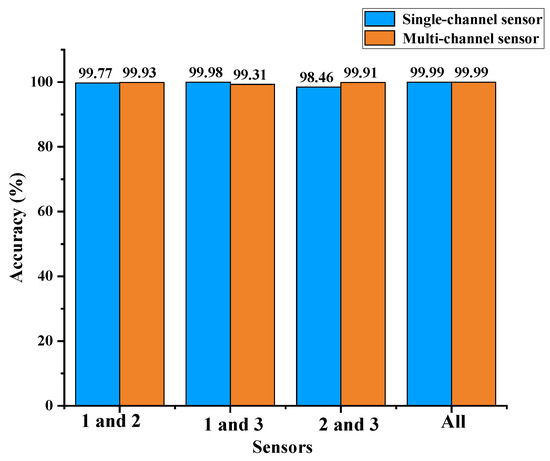 According to Figure 21, the diagnostic accuracy of the multiple-channel single sensors before fusion was higher than that of the single-channel, by 3.01%, 16.7%, and 5.17%, respectively. It can be proved that the multi-channel for the comprehensive data acquisition can improve the diagnostic accuracy. In order to improve the diagnostic accuracy of the gear fault identification, the DS evidence theory method was used in order to fuse three sensors of gearbox gear teeth, as shown in Figure 22. Both single-channel fault diagnosis and multi-channel diagnosis accuracy were improved and the accuracy of the multi-channel diagnosis after fusion was also mostly higher than the accuracy of single-channel diagnosis after fusion when the fusion theory was used.