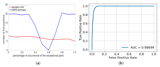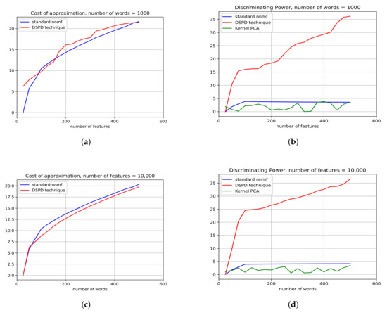 Figure 2c,d describes the value of the sum of the former two terms of Equation (1). These terms represent how good the factorization approximates the input matrices, and this is the unique goal of standard nnmf methods. The figure shows that, despite the fact that the goal of our technique is relevantly changed, it is able to provide a good approximation. Indeed, we study the behavior when the number of features changes and the number of words is kept fixed at 1000 and, also, the behavior when the number of features is kept fixed at 10,000 and the number of words change. In both cases, the difference in approximating the original data is very low, witnessing that the proposed modification does not relevantly change the approximation quality.