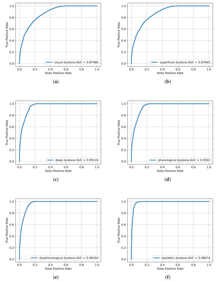 Figure 4. Experiments on real data for different kind of dyslexia, namely visual (a), superficial (b), deep (c), phpnological (d), dysphonological (e), dysidetic (f).
