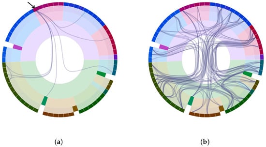 Regarding the adjacency edges, in addition to the previously mentioned edge bundling technique, other options have been incorporated to modify their trajectory. Specifically, in the case where the dataset includes different types of connections (multi-layer network), each category can be depicted with a small offset (that can be modified interactively) to avoid overlapping among them (Figure 9). The self-connections will run on the outside of the sunburst to reduce the overlap with the rest of the adjacency edges (Figure 10a). Following the same approach, connections between siblings can optionally be shifted to the outside of the sunburst, thereby enabling a better perception of the relationships within a parent node since they are not obfuscated by the rest of the connections in the dataset (Figure 10b).