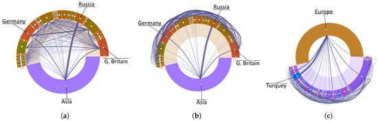 With the purpose of inspecting the routes between the two most connected continents (Europe and Asia), we proceed to filter out the rest of continents and uncollapse Europe (Figure 15a). To reduce visual clutter, sibling connections at the country level (in this case, European internal routes) can be depicted on the outward side, allowing a better analysis of the available routes between Asia and European countries (Figure 15b). It is immediately observed that Russia is the country of the European continent with the highest number of routes to Asia, followed by United Kingdom and Germany. Uncollapsing Asia we see that Turkey is the Asian country most connected to Europe (Figure 15c).