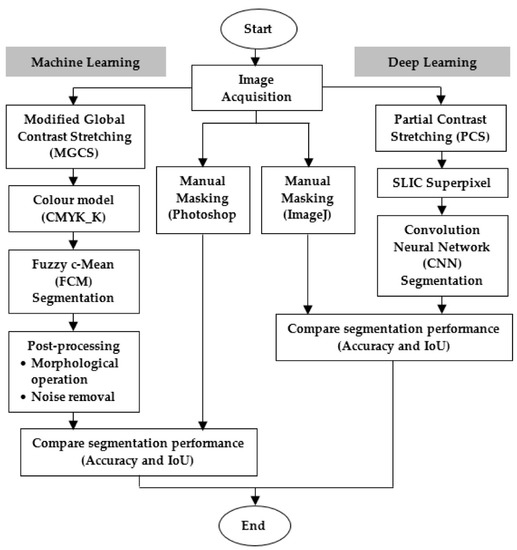Flow chart for the techniques proposed for machine learning and deep learning segmentations.
