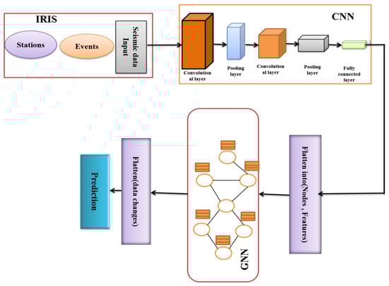There are several advantages of using CNN on seismic waveform data: (1) It operates directly on waveform data with little preprocessing and without feature extraction; (2) it is shifted invariant and not sensitive to the time position of the feature (P- or S-waves); and (3) it does not make explicit use of existing physics-based knowledge such as S-P difference, or seismic travel times. The proposed methodology used in this study is shown in Figure 1. First, three component wave-from data are downloaded from IRIS (Incorporated Research Institute for Seismology). After preprocessing, in the second step, we use a CNN to examine the waveforms of a specific station. The three-component waveform is processed by this CNN, and then a set of features is extracted from it. After that, the geographic location (latitude and longitude) of the seismic station is appended to the feature vector to create it. In the third step, this feature vector is used as an input by the second component, which is a GNN. This GNN will recombine the time series features with the station location to create a final station-specific feature vector. This procedure is carried out once for each of the stations that make up the network, utilizing the CNN and GNN components in the same way (i.e., the same operations are applied to each station individually). Only along the time axis are the processes that constitute the convolution carried out. Output is flattened and the final prediction about the magnitude, location, and depth is made finally. The architecture of the proposed model is given in detail in Figure 2.
