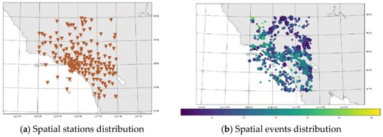 We use a python library ObsPy to collect data for datasets [32,33]. ObsPy downloads the broadband inventory and earthquake catalog of the Southern California Seismic Network (SCSN (doi:10.7914/SN/CI)). In the dataset, there is a total of 1427 events collected from 187 stations from the period 31 January 2000 to 31 December 2015 (15 years). For both seismic stations and event locations, we set the limits for latitude from [32° to 36°] and longitude [−120° to −116°]. Maps of stations and events considered in this study are given in Figure 3. The locations of these seismic stations are shown as triangles in Figure 3a and the event locations are shown as dots in Figure 3b. Statistics of the dataset are given in Table 2.