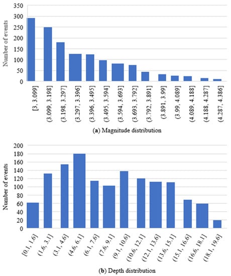 The magnitude distribution and depth distribution of each event are shown as Histograms in Figure 4a,b. Magnitude distribution shows that events are not equally distributed concerning the magnitude values. Half of the events in the dataset have magnitude ranges from 3.0 to 3.13. Only a few events have a magnitude greater than 3.9. The average magnitude value of all the events is 3.3. On the other side depth distribution, more than 60% of events have a depth range from 1.7 km to 10.2 km. Only a few events have a depth of more than 20.0 km. The average value of the depth in the dataset is 9.0 km.