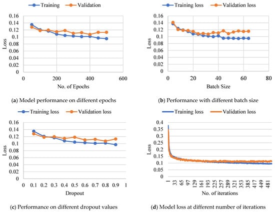 Model performance using different values of epochs in (a), batch size in (b), dropout in (c), and iterations in (d).