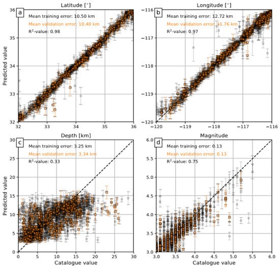 Mean absolute error for training and validation sets obtained from the California dataset. Predicted values by the BNGCNN model and the actual values for (a) latitude, (b) longitude, (c) depth, and (d) magnitude by inserting geographical information.