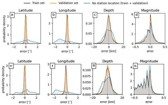 On the training and validation datasets, we examine the model’s performance with and without station position information. The results are shown graphically in Figure 8a–d for the baseline model and Figure 8e–h for the BNGCNN model. The black color line shows the training error, the yellow line for validation error, and the blue line for errors when no station location information is used. The performance of the model when including the geographic locations of the stations is examined separately for both the train data set and the validation data set, and the results demonstrate minimal overfitting. The performance is evaluated using the combined data set even when the station locations are not included in the analysis. The model posterior is calculated by running inference 100 times on each event in the training and validation catalogs and determining the related mean and standard deviation while retaining dropout regularization. For GNN, both data sets produce similar results, indicating that overfitting on the training set is minimal. The mean absolute difference between catalog data and model projections is less than 0.13 for magnitude, 3.3 km for depth, and less than 0.11° (13 km) for latitude and longitude (which translates to a mean epicentral location error of 18 km). For the proposed BNGCNN model, averaging the latitude and longitude values from the catalog and model predictions, the mean absolute difference is less than 10 km in distance for the latitude and longitude (resulting in a mean epicentral location error of 18 km), 2.6 km in depth, and 0.09 in magnitude. The approach produces a respectable first-order estimate of location and magnitude that can be used as a starting point for further refinement using typical seismological instruments. The magnitude curve in Figure 8h illustrates some prominent peaks than Figure 8d. This is because of the scale and shift operations that a batch normalization layer uses [13]. Unlike the input layer, which requires all normalized values to have a zero mean and unit variance, Batch Norm allows its values to be shifted (to a different mean) and scaled (to a different variance). It does this by multiplying the normalized values by a factor, gamma, and adding to them a factor, beta. Therefore, the results in Figure 8b are different than Figure 8h.