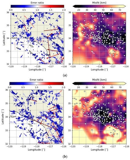 Figure 9a,b show the difference between the event’s actual epicenter and the predicted epicenter of GNN and BNGCNN, respectively. Each arrow represents a single cataloged event, beginning from the predicted epicenter and pointing to the catalog epicenter. The colors represent the misfit ratio over the model posterior’s 95 percent confidence interval. As a result, the blue color denotes that the catalog epicenter is within the 95 percent confidence interval, while the red color denotes that it is not. We can compare the posterior’s confidence intervals with the actual epicenter location error because we can compute the posterior distribution for each event. A model error ratiometric, which measures the distance between predicted and observed epicenters, is used to illustrate the model uncertainty. This metric is normalized by the model posterior’s 95% confidence interval. A score of 1 indicates that the genuine epicenter location falls within a 95 percent confidence interval, while a value of 0 indicates that the true epicenter location does not lie within the confidence interval at all. In most cases, the error ratio is less than one. This means that the model posterior distribution’s expected aleatoric uncertainties are substantially smaller than the actual epistemic uncertainties.