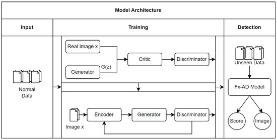 The visualization of the abnormal part is then explained using the localization technique as a result of the anomaly detection, along with the abnormal score. F-AnoGAN is divided into two stages: WGAN and encoder [20]. The GAN learns two models: Generator G and Discriminator D, which describe the distribution of trained data and attempt to produce similar images, which compete with each other and categorize the fake data generated by the generator through an adversarial process. The WGAN is a data classification algorithm that can improve the output performance by redefining metrics for convergence values. It also simplifies the model based on the distance of Wasserstein from Jensen-Shannon. The first step in building the model is to train the WGAN so that The Generator G only learns the distribution of normal data from the data to be learned, resulting in only normal images. The encoder is then trained to map the image to the latent space. F-AnoGAN is randomized in the process of mapping images in AnoGAN, and AnoGAN, which learns, is not well mapped. To address this issue, F-AnoGAN employs AutoEncoder’s Encoder model [29]. Encoder models are compressed, as the input data are characterized by latent vectors. The reason for using the encoder model is to prevent the generator from generating normal data when the test data are input to the WGAN. The GAN weight is fixed at this point, and if the query image is entered into the GAN during the TEST process, the generator will only generate normal data unrelated to the query data. The method of mapping to Latent space is based on an encoder, and training is conducted to enable , inverse mapping. Anomaly detection is performed based on a trained model that includes the discriminator feature secondary loss and image reconstruction error G(z).