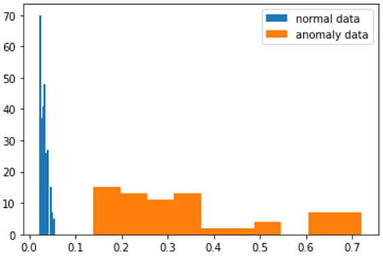 Figure 8 shows a histogram of the scores for normal and abnormal data. The normal image distribution of the histogram graph is 0.15 or higher and 0.06 or lower. This demonstrates that the threshold for anomaly scores was set to a value between 0.06 and 0.15. The Results for the normal and abnormal data have significant implications and are visible. Anomaly scores can be represented as important indicators of the anomaly detection results in the process. In the graph, the x-axis represents the outlier score and the y-axis represents the number. Furthermore, the proposed anomaly score in F-AnoGAN can distinguish between bad and normal data, and the comparison image obtained from the difference between the test and generated images can accurately determine the abnormal part.