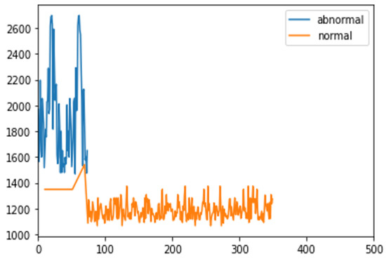Figure 9 shows a graph of the loss function obtained using the F-AnoGAN model. The x-axis represents the number of data points and the y-axis represents the loss value. The above figure shows that the experimental results of F-AnoGAN and AnoGAN were excellent. The loss value of F-AnoGAN is lower than that of AnoGAN and the images created by F-AnoGAN are more sophisticated than those created by AnoGAN.