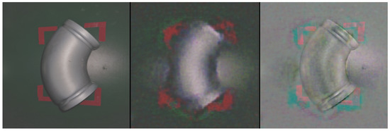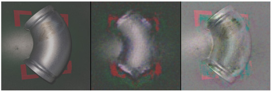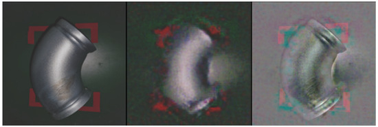 Figure 12 shows the result of the abnormal detection of a real image without a crack. The image on the left shows the image data of the normal product obtained during the chromate process. The middle image is an image generated by the generator, and the normal image does not reach the same resolution as the real image but produces a compliant false image. The final image compares the real image learned through the encoder with the fake image generated by the generator. Compared to Figure 11 and Figure 12, the abnormal location of the dark black area was not found, demonstrating that the normal image was correctly detected.