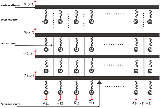21]. Layered metamaterial structures are metamaterial structures with multiple horizontal beams arranged in layers and linked up with each other through vertical beams. For such layered metamaterial structures, the local resonators are replicated on each beam in a continuous pattern. Layered metamaterials find unique potential in situations where more unit cells are needed and elongation of the single beam is impracticable. The application of layered metamaterial beams in dual-purpose vibration isolation energy harvesting using piezoelectricity was demonstrated by Li et al. [
