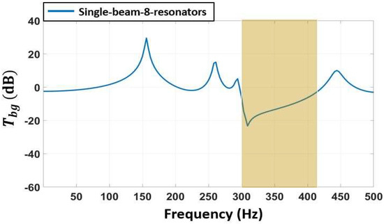 18]. Starting with a single horizontal beam metamaterial structure with eight unit cells (resonators) and analyzing Equations (1)–(3) numerically and substituting the results into Equation (6), yields the FRF transmissibility shown in