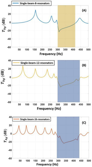Figure 8 shows two main outcomes. First, a major broad frequency bandgap lives near resonance frequency of the local resonators, i.e., 298–410 Hz for 8, 12, and 16 local resonators, respectively. These frequency bandgaps did not witness a significant change in their width as the number of local resonators increased. This is likely because there was no alteration to the shape and design of the local resonators. Moreover, as the number of local resonators per horizontal beam is increased from 8 to 16 additional bandgaps opened up. These additional bandgaps tend to exist in the lower frequency region. For example, as shown in