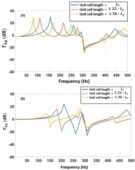Figure 9A, the results show that as the unit cell’s length of the single-beam metamaterial structure was varied, no significant extra bandgaps opened up. The region of the local resonator bandgap remained mostly unaltered when the length of the unit cell was changed. However, in