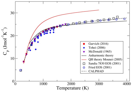 Experimental (red squares) [38], (blue diamonds) [8], and (purple triangles) [39] specific heats. Anharmonic (black line), quasi-harmonic (QH) (red line) [7], Sandia EOS model (open black squares) [33], Fried et al. EOS model (open blue circles) [40], and CALPHAD (black dashed line) [32] specific heats.