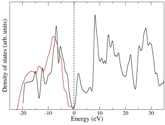 Calculated (FPLMTO) electronic density of states (black line), broadened with a 20 mRy Gaussian, together with X-ray photoemission spectra with 122 eV photons (red line) [41]. The Fermi level is at zero energy, and it is indicated with a vertical dashed line.