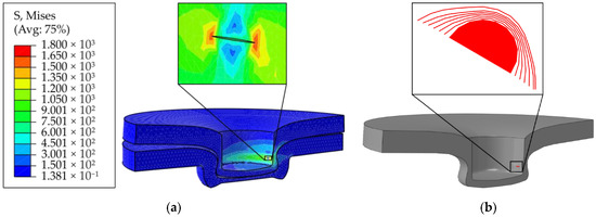 A simulation of the model with the above specified boundary and loading conditions is performed. The location with the maximum value for principal normal stress is selected as the location for the initial crack, as shown in Figure 4. The place to insert the initial crack is in the punch-sided sheet; see Figure 4a. As shown in Figure 4b, an initial semi-circular crack of radius 0.15 mm is inserted in the punch-sided sheet at the place where the maximum principal stress is at its highest value.