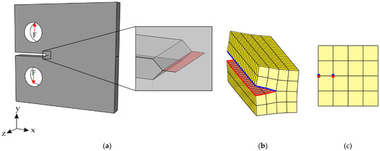 To explain the procedure of such simulations, a simple model of a CT specimen is utilized in this paper. The model of the CT specimen and the submodel for the initial crack are shown in Figure 7. The CT specimen with the loading situation and the initial crack are displayed in Figure 7a. In this case, the crack lies in the XZ plane, which is one of the three principal planes. The submodel along the crack front generated by Adapcrack3D for this structure is illustrated in Figure 7b. The cross-section of the submodel without the gap between the crack faces is shown in Figure 7c.