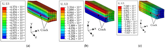 When the crack surfaces lie on top of each other, the nodes on crack surfaces, which appear above each other, also have the same coordinates. In Figure 7b, the nodes on the crack surfaces, and especially the ‘driven nodes’ on the red and blue line, not only lie on top of each other but also have the same coordinates. In the cross-sectional view in Figure 7c, the red and blue nodes have the same coordinates. As described above, if the nodes that appear in the yellow region are selected as ‘driven nodes’, then the adjacent red and blue nodes are mapped with the same displacement from the global model and the simulation of the submodel returns incorrect stress distribution. This is evident in Figure 8, which shows the displacements in the model along the principal axes: Figure 8a (displacement along x-axis), Figure 8b (displacement along y-axis), and Figure 8c (displacement along z-axis). Because the crack is loaded in the Mode I direction, the correct result should have been an opened crack.