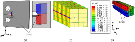 Geometry of the new submodel: (a) Submodel with smaller elements close to the crack surfaces; (b) Cross-section of the submodel with ‘driven nodes’, in which the nodes from the crack surfaces are not selected; (c). The displacement in the new submodel in the x-direction.