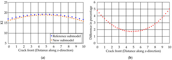 Stress intensity factors calculated by Adapcrack3D for CT specimen and the difference between the results: (a). Stress intensity factors along the crack front for Mode I loading of the reference submodel and the new submodel; (b) Difference in percentage between the values in Figure 11a along the crack front.