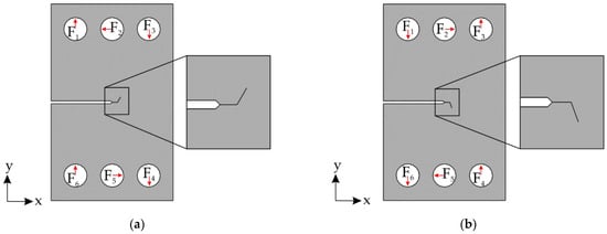 Models for performing simulations are created with the initial cracks and the deflected cracks, as shown in Figure 13. Figure 13a is the crack that deflected at 60° upwards and Figure 13b is the crack that deflected downwards at 70°. Because the cracks do not have an influence on one another during crack growth, they can be modelled and simulated separately. The loading situations for both cracks are also shown in Figure 13a,b, with the values as shown in Table 2. For the crack that deflected downwards, the loads are −1.6 times larger than the loads that are defined for the crack that deflected upwards. Because both crack branches grew simultaneously, the assumption here is that the loads were chosen in such a way that the stress intensity factors calculated are almost the same for both cracks.