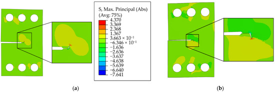 Maximum principal stresses in global models of CTS specimen with deflected cracks: (a). Crack with upward deflection of 60° and Mode I loading along the crack surfaces; (b) Crack with downward deflection of 70° and Mode I and Mode II loadings along the crack surfaces.