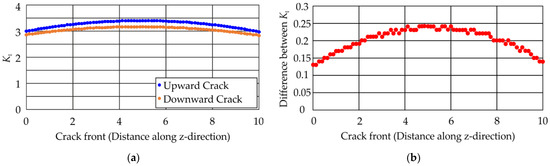 The stress intensity factors at the crack tip calculated from both models are shown in Figure 15. Figure 15a displays the stress intensity factors KI along the crack front for both the cracks. For the crack that deflected upwards (Figure 14a), the values are shown in blue and for the crack that deflected downwards, the values are shown in orange. As assumed, the stress intensity factors calculated for both crack branches lie very close to each other. The difference between the stress intensity factors for both crack branches is shown in Figure 15b. The maximum difference between the values is 0.24, and the minimum difference is 0.13.