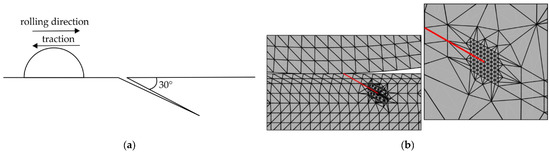 Rolling procedure and FE model to simulate rolling contact fatigue (a). Rolling procedure with rolling direction, traction, and crack at an angle of 30°; (b) Detail from the FE model along with the crack.