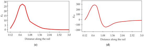 The stress intensity factors along the crack front are calculated in Adapcrack3D for plane strain state. The newly proposed submodel with the contact definition between the crack surfaces is also created for this simulation. In the simulation, the rolling of the wheel over the rail is performed for a distance of 3 mm, starting from the left side of the crack and then rolling over the crack to the right side. The course of the stress intensity factors is compared with the simulation results from [44]. The stress intensity factors, KI and KII, from the literature and the same calculated in Adapcrack3D are displayed in Figure 17. The principal course of the stress intensity factors calculated in Adapcrack3D agrees well with the course of the stress intensity factors from the literature. The tendency of KI having a maximum value when the wheel approaches the crack and thereafter reducing to values close to zero is apparent in the results (Figure 17a,c). Similarly, in the case of KII, the values rise as the wheel approaches the crack, and then the values drop below zero. When the wheel rolls away from the crack, the values advance back to zero (Figure 17b,d).