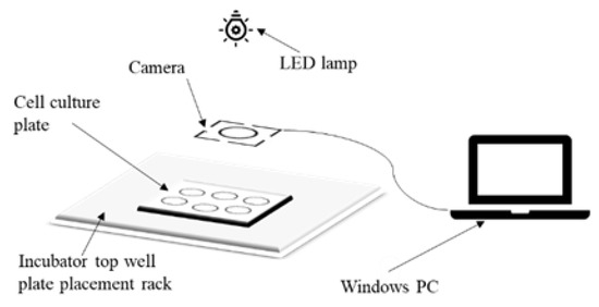 The equipment and materials used in this experiment include K562 cells, Costar3516 well plates (New York, NY, USA), cell culture medium (meilunbio RPMI1640 (1×) (Dalian, China), Sijiqing fetal bovine serum (Huzhou, China)), a Shanghai Tianda instrument pHS-3C-PH meter, an ATM industrial camera (China), a Philips LED white strip lamp (The Kingdom of the Netherlands), and a computer running Windows. The acquisition device was fixed above the incubator of the automatic cell culture equipment, 40 cm away from the orifice frame, connected to the computer by the data line, and the image acquisition was controlled by the software in the computer. After absorbing the cell fluid and injecting it into the well plate, the plate was placed on the well plate rack on the top layer of the incubator, as shown in Figure 1, for image acquisition.