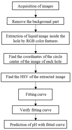 First, the preprocessing algorithm to preprocess the collected image was selected in order to remove the background part and capture the liquid part in the hole. Then, the images of each hole were extracted separately and binarized, the centroid coordinates of the connected domain were obtained, and the image corresponding to each hole was obtained for holes 1–6. The model of HSV and pH of cell culture medium was established, and the relationship curve between HSV and pH of cell culture medium was fitted. The specific process is shown in Figure 2 below.