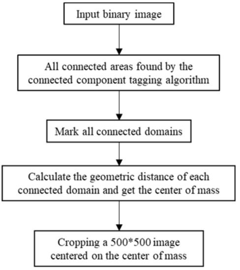 Next, the centroid coordinates of the connected domain were obtained [21]. The position coordinates of the center of the liquid in each hole were determined in turn. Using this as the center, a 500 × 500 image was cut out. The HSV of the hole image was replaced by the HSV of the clipped image. The image center distance was used to locate the centroid, which was marked as ‘*’ for the liquid in the hole. The algorithm flow is shown in Figure 5.