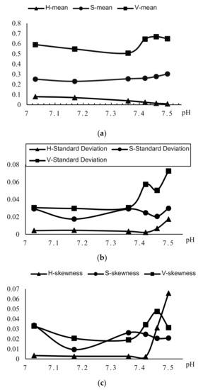 As the time in cell culture increases, carbon dioxide in the incubator undergoes a neutralization reaction with buffer substances in the culture fluid. The phenol red color development in the culture fluid gradually changes from red to orange and finally to yellow. Its color feature is often the standard to determine whether to change the liquid. The color feature is a global feature that describes the surface properties of the corresponding field within an image or image area. Color feature descriptions can be divided into color histograms, color moments (color distribution), color sets, color aggregation vectors, and color correlation plots [22,23]. A color moment in HSV color space was used as a color feature in this study [24,25,26]. As the color information is mainly distributed in low-order moments, the first, second, and third-order moments were sufficient to represent the color distribution of the image. The advantage of this method is that color space quantization is not required, and the dimension of the eigenvector is low. Its mathematical definition is: