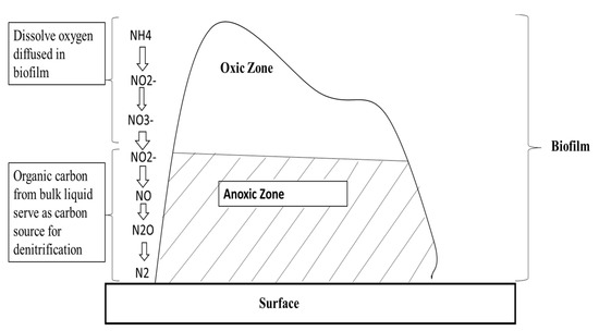 Tian et al. [9] proved that pre-seeding with an existing biofilm improved the biofilm formation, thereby improving the NH4+-N removal. Wang et al. [10] also proved that dosing the reactor with acylated homoserine lactones (AHLs) and exogenous quorum-sensing substances improved the biofilm’s thickness. Furthermore, the benefits of using biofilms in WWTPs are widely studied. However, there are still limited reports on the ways of exploiting the biofilm’s properties to enhance the removal of inorganic materials such as total nitrogen (TN) and phosphorus. Hence, this paper reviews the different ways that the biofilm’s characteristics can be exploited to promote the maximum removal of inorganic materials.