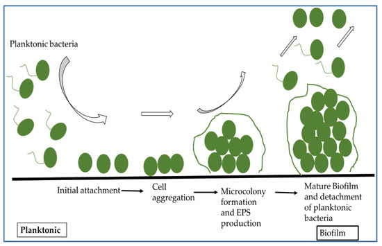 The formation of a biofilm is a complex process that is influenced by the conditions of the surroundings, such as the properties of the surface and the deposition of the organic materials in the surface carrier. Before the microorganism attaches to the surface for biofilm formation, the surface will initially be acclimatized to adsorb organic molecules present in the surrounding environment. This step is followed by the attachment, adhesion, retention, and proliferation of the microorganisms to the surface (Figure 2). The motile bacteria, which have flagella and pili, are responsible for initiating biofilm adhesion to the carrier material. The flagella is essential in the movement of bacteria from the planktonic state to the surface.
