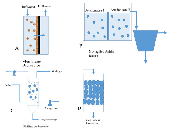 Illustration of popular biofilm reactors for wastewater treatment: (A) membrane bioreactor; (B) moving bed biofilm bioreactor; (C) fluidized bioreactor; (D) packed bed bioreactor.