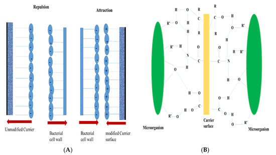 Interaction between the carrier surface and bacterial cell surface: (A) electrostatic interaction between the cell surface and the carrier surface; (B) hydrogen bond formation between the bacterial cell surface and carrier surface [32].