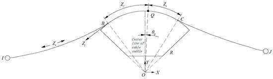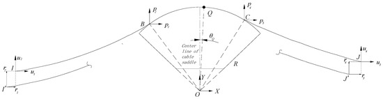 The calculation model of the cable saddle is shown in Figure 5. The coordinate system XOY is established with the center O of the groove in the cable saddle as the origin. In practical engineering, the main cable of the cable saddle section is not allowed to be completely separated from the saddle. Generally, the main cable and the cable saddle are fixed near the center line of the cable saddle. This paper calls it the fixed point of the cable saddle, expressed in Q, as the known point.