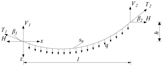 Based on the basic assumption, the main cable can be simulated by an elastic catenary with uniformly distributed dead load along its unstressed length, as shown in Figure 6. The self-weight uniform load of the cable is q, and the none-stressed length is , the tensile stiffness is EA, the span between two fulcrum is l, the height difference is h, and the horizontal tension is H. The vertical reaction force at the left end of the strand is V1. The angle between cable force and horizontal direction is β1. The vertical reaction force at the right end of the strand is V2 = qS0 − V1. The angle between cable force and horizontal direction is β2. Then, the curve expression satisfying the boundary conditions is as follows: