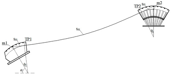 According to the principle that the non-stress length between the control points of two saddles is invariable, the strand between two adjacent saddles is divided into three sections. The length of the cable segment between saddle control point and tangent point TP1 is , the length of the freely suspended cable segment between tangent point TP1 and tangent point TP2 is , and the length of the cable segment between tangent point TP2 and saddle control point is . Assuming that the stressed length of and is equal to the non-stressed length (through calculation, the difference between the empty cable state is very small, and the error can be ignored), then, = + + . For the freely suspended strand between the adjacent tangent points, when the horizontal distance l, height difference h and non-stressed cable length between two end points are determined, the strand shape is unique and satisfies the catenary equations composed of formulae (31) and (32). The sectional calculation diagram of the tangent point of the cable strand is shown in Figure 8. In the figure, α is the included angle between the left cable saddle and the horizontal axis, and θ1 and θ2 are the included angle between the line passing through the arc center and tangent point of the cable saddle and the cable saddle axis, respectively. By iterating the length of and the tangent point position is corrected. When the tangent angle at the tangent point of the saddle is consistent with the force inclination angle at the end of the strand, the tangent point position is determined. Then, according to the catenary formula, the elevation of cable strand at any position can be determined.