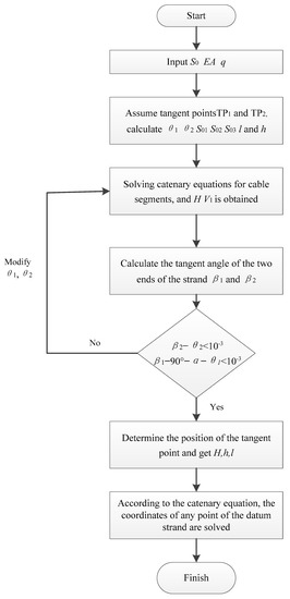 The calculation process of the accurate solution method for the datum strand geometric shape is shown in Figure 9. According to the calculation flow, MATLAB language can be used to write the program of exact solution of the cable strand line.