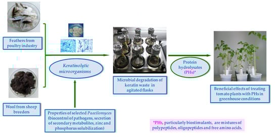- Cavello, I.A.; Crespo, J.M.; García, S.S.; Zapiola, J.M.; Luna, M.F.; Cavalitto, S.F. Plant growth promotion activity of keratinolytic fungi growing on a recalcitrant waste known as Hair Waste. Biotechnol. Res. Intern. 2015, 6, 1–10. [Google Scholar] [CrossRef] [PubMed]