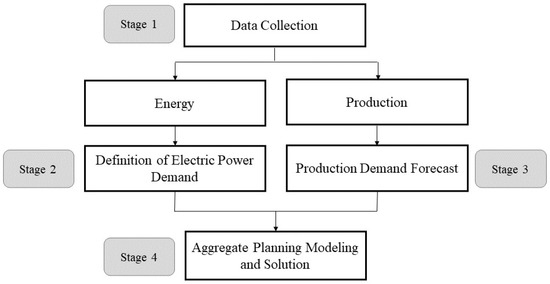 Figure 1 presents the model proposed in this work to integrate energy demand forecasting and aggregate planning, which is composed of four steps: (i) Data collection; (ii) Power Demand Definition; (iii) Production Demand Forecast; and (iv) Aggregate Planning Modeling and Solution.