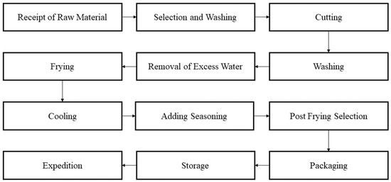 Initially, the raw material arrives at the unit already processed (cleaned and peeled). Afterward, the potatoes are washed and directed by an infinite conveyor for a selection, in which the employees cut the defects presented. Next, they follow the conveyor belt and go through the slicing stage, utilizing a cutter according to the model of the potato produced (straw potatoes, wave potato chips, and plain potato chips). Then, the sliced potatoes are washed to remove the starch.